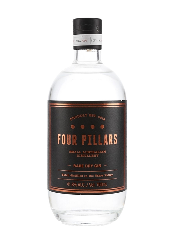 A bottle of Four Pillars Rare Dry Gin, produced in Australia.