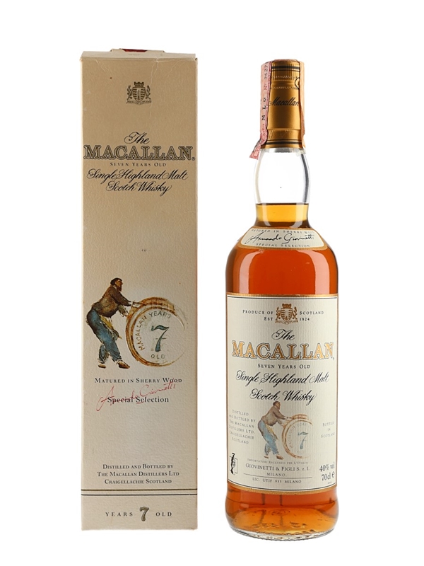 A bottle of The Macallan 7 Year Old Single Highland Malt Scotch Whisky, exclusively matured in selected Spanish sherry casks and imported to Italy by Giovinetti, we estimate in the 1990s to early 2000s.