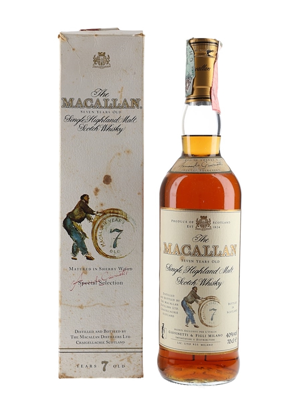 A bottle of The Macallan 7 Year Old Single Highland Malt Scotch Whisky, exclusively matured in selected Spanish sherry casks and imported to Italy by Giovinetti, we estimate in the 1990s to early 2000s.