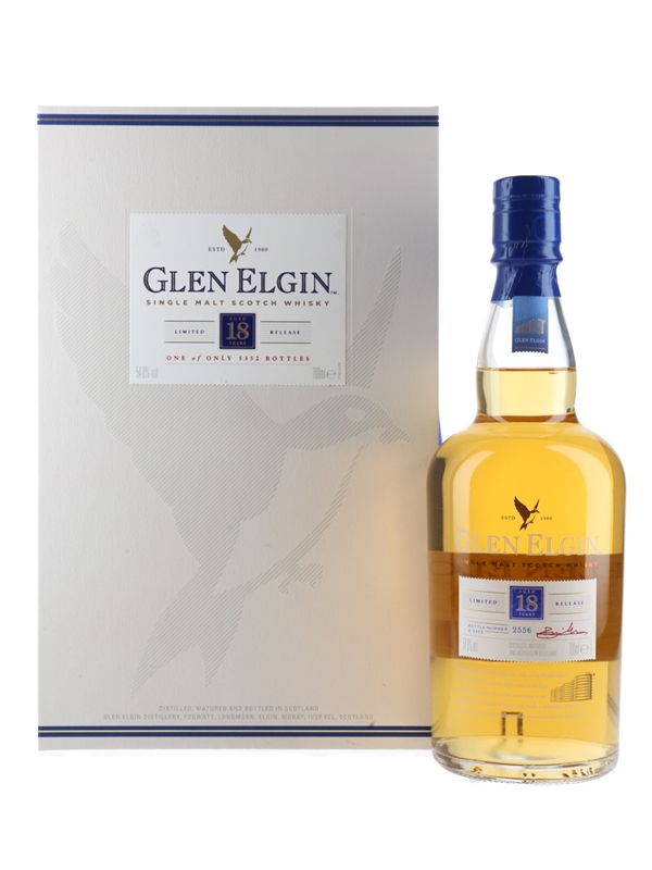 A bottle of Glen Elgin 18 Year Old Single Malt Scotch Whisky. This was distilled in 1998 and bottled at natural cask strength in 2017 for Diageo's Special Releases series.