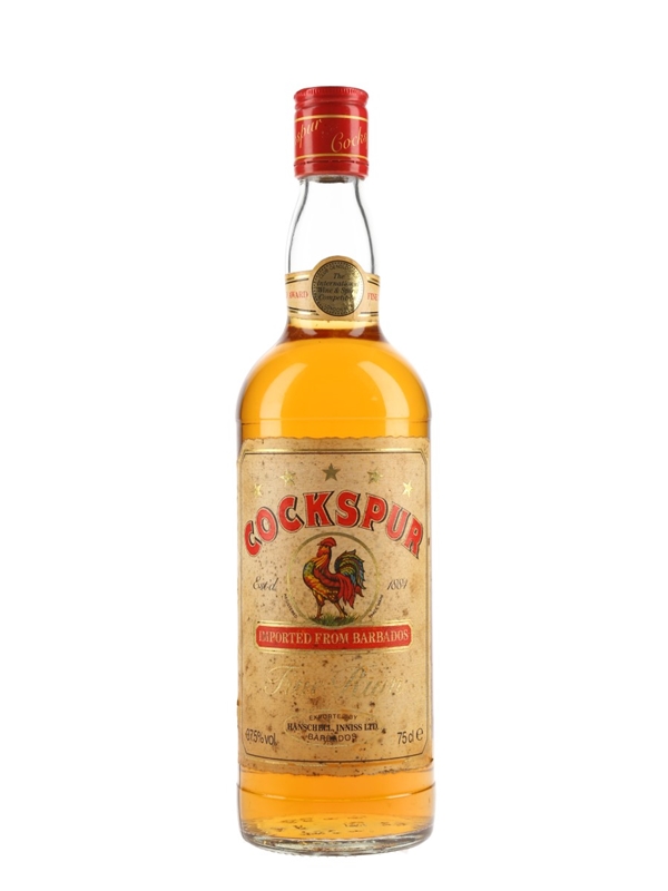 A bottle of Cockspur 5 Star Barbados Rum. This was aged for at least three years in oak casks and exported by Hanschell Inniss, Bridgetown, Barbados. We estimate this was bottled in the 1980s.