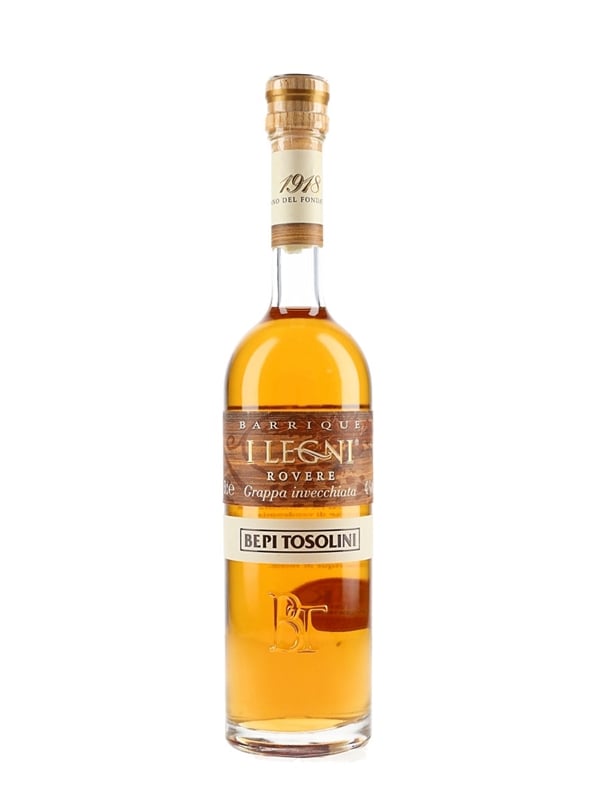 A 50cl bottle of Grappa I Legni Rovere aged in oak casks, distilled and bottled in Italy by Bepi Tosolini. This is made from a blend of Cabernet, Refosco, Merlot, Friuliano and Moscato grape marc.