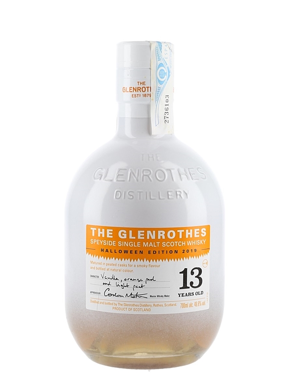 A bottle of The Glenrothes 13 Year Old Speyside Single Malt Scotch Whisky. This 2019 Halloween Edition was matured in peated casks and bottled at 46.6% ABV.