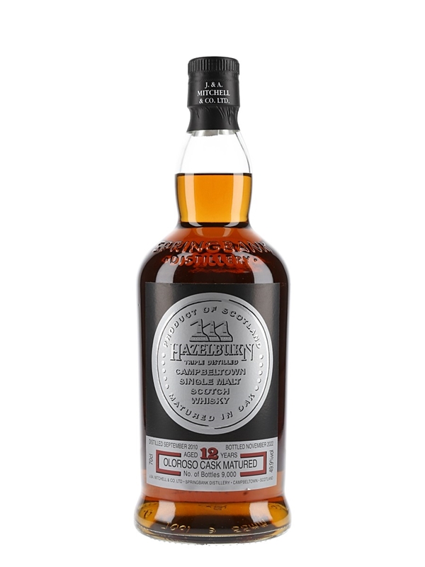 A bottle Hazelburn 12 Year Old Campbeltown Single Malt Scotch Whisky. This was triple distilled in September 2010 at Springbank distillery, matured in fresh oloroso sherry casks and bottled in November 2022. This is one of 9000 bottles.