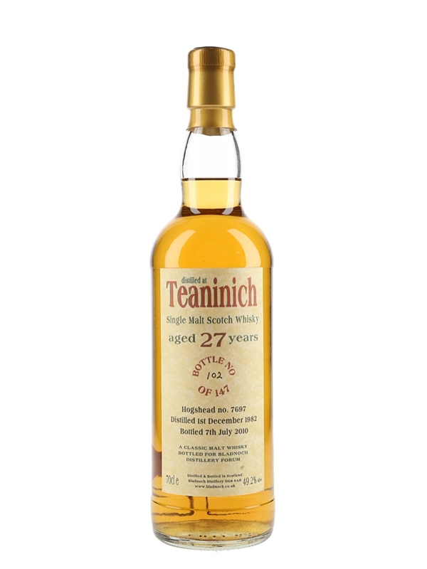 A bottle of Teaninich 27 Year Old Single Malt Scotch Whisky. This was distilled on 1st December 1982, matured in a single hogshead cask and bottled at 49.2% ABV in July 2010 for Bladnoch Distillery Forum.