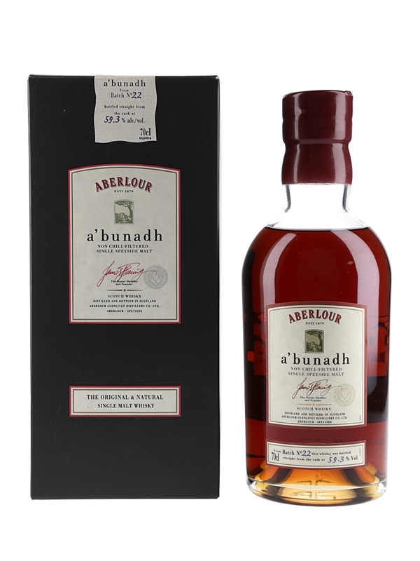 A'bunadh is Gaelic for 'the origin' and was first produced in 1997. Each annual release is drawn from oloroso sherry butts with ages ranging from five to 25 years. The whisky is not chill-filtered, and is bottled at natural cask strength.