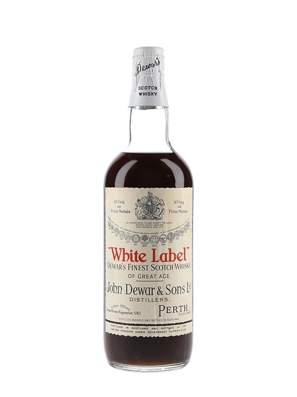 A bottle of Dewar's White Label Finest Scotch Whisky produced by John Dewar & Sons Ltd and sealed with a spring cap closure.