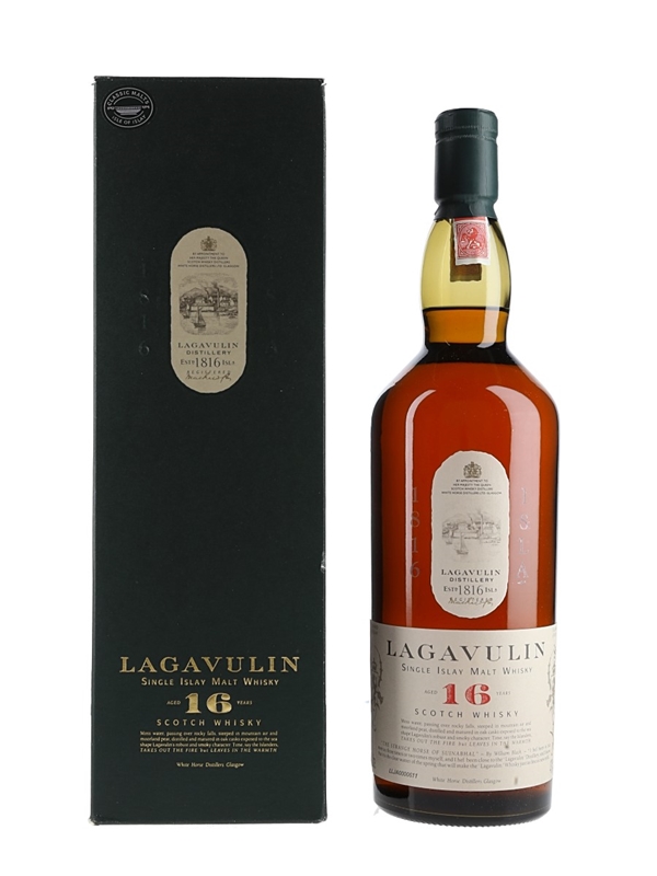 A litre bottle of Lagavulin 16 Year Old Single Islay Malt Scotch Whisky, part of Diageo's Classic Malts of Scotland range. We estimate this was bottled in the 1990s when the distillery was owned by White Horse Distillers.