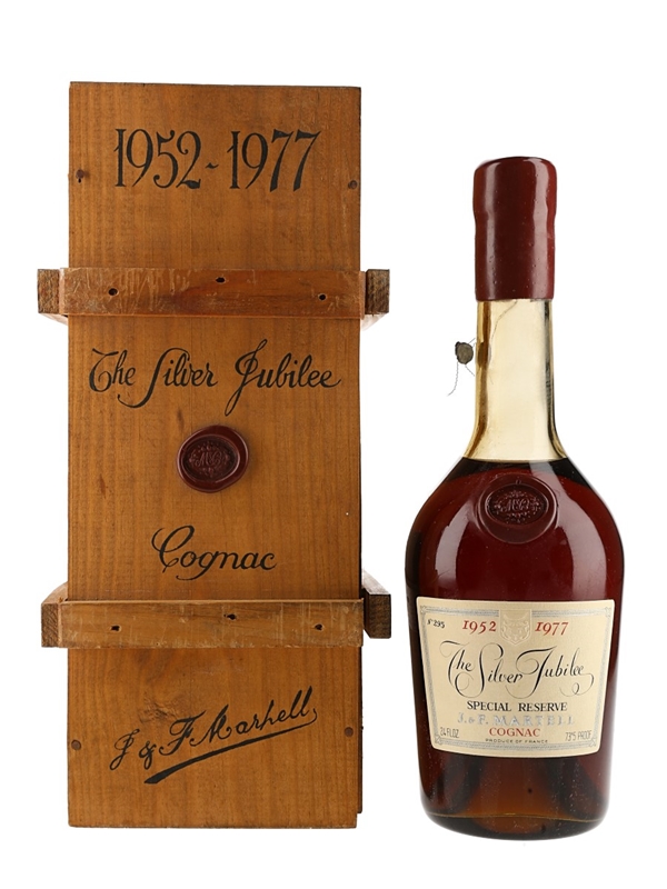 A bottle of Martell Silver Jubilee Cognac presented in a wooden case and bottled at 42% ABV. This bottling comprises four vintages, 1815, 1906, 1914 and 1918, and was released to celebrate Queen Elizabeth II's Silver Jubilee in 1977.