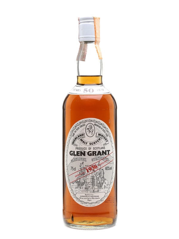 A bottle of Glen Grant 50 Year Old, distilled in 1936 and bottled in the 1980s by Gordon & MacPhail.