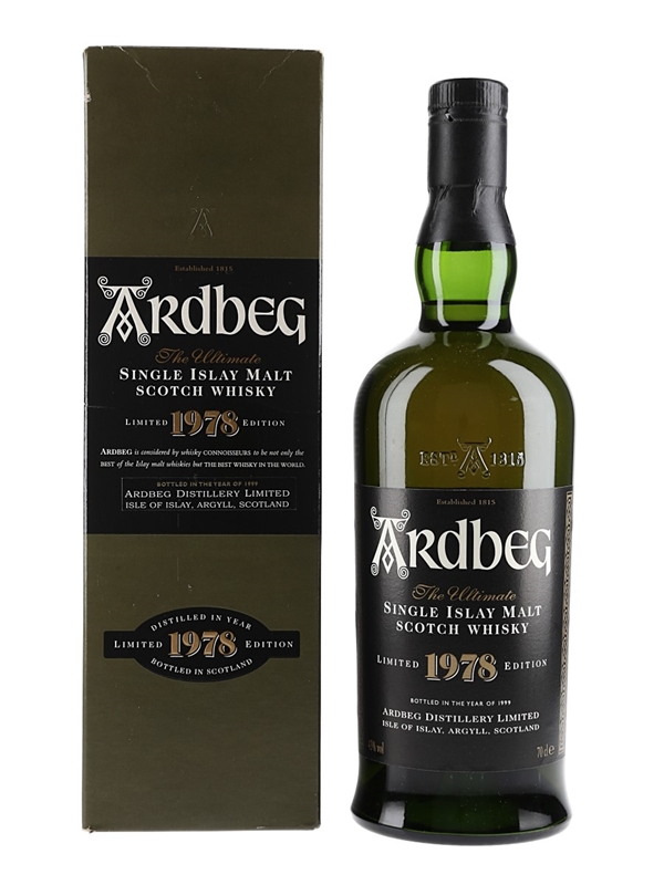 A limited edition bottle of Ardbeg 1978 The Ultimate Single Islay Malt Scotch Whisky, bottled in 1999.