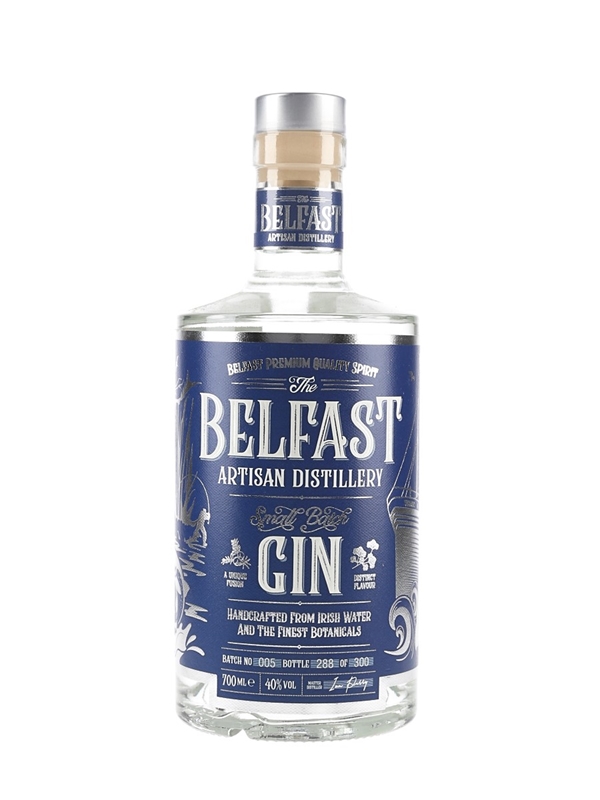 A bottle of Belfast Artisan Distillery Gin distilled and bottled by hand in Belfast. This is bottle number 288 of 300 bottles from batch number 005.
