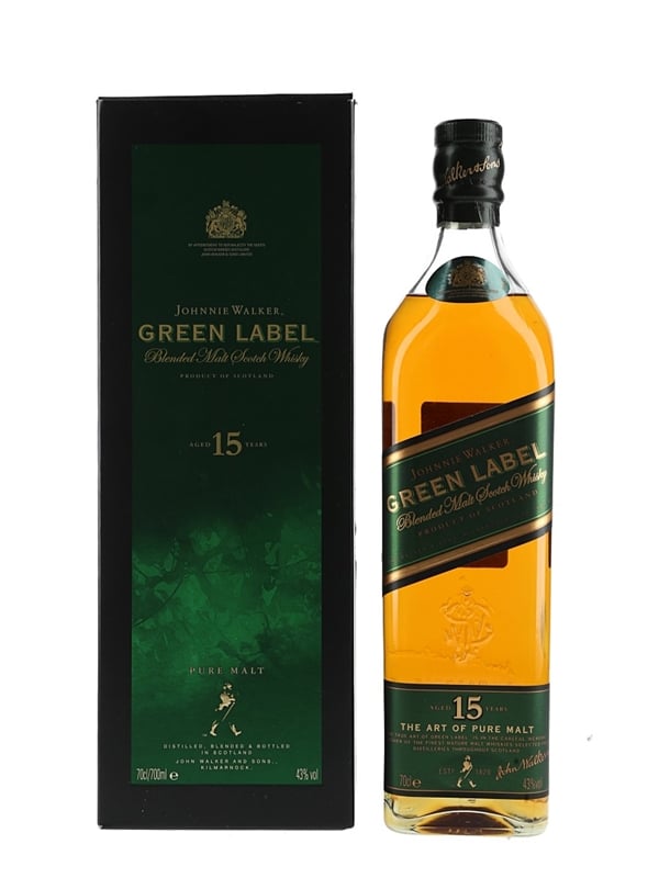 A bottle of Johnnie Walker Green Label 15 Year Old Blended Malt Scotch Whisky.
