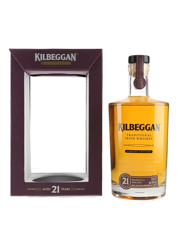 A bottle of Kilbeggan 21 Year Old Limited Edition Traditional Irish Whiskey. This was matured in a combination of bourbon, port, Madeira and sherry casks, and bottled by Cooley Distillery.