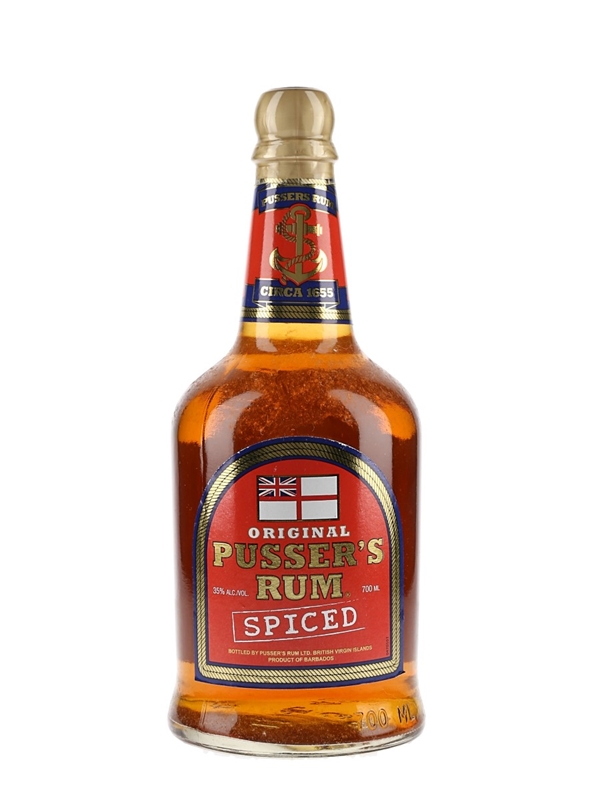 A bottle of Pusser's Spiced rum, a blend of fine Caribbean rum and spices.