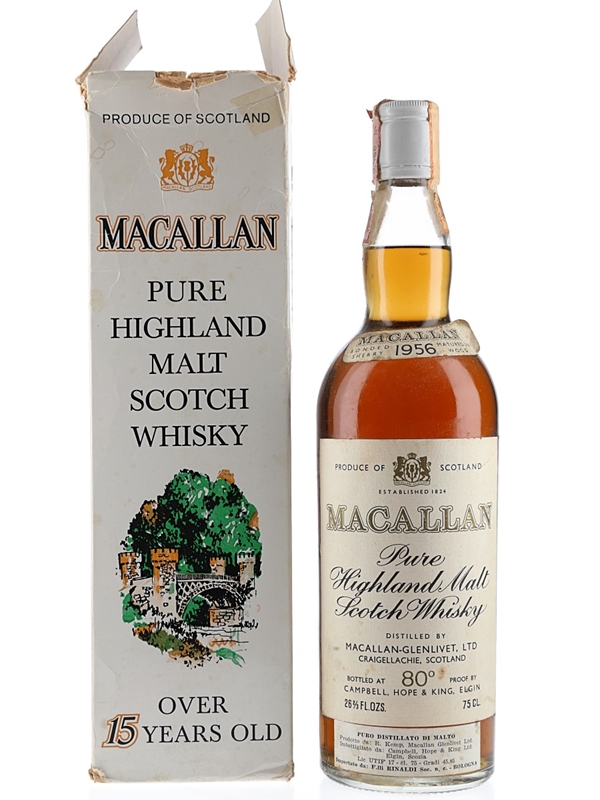 A bottle of The Macallan 1956 Pure Highland Malt Scotch Whisky, bottled by Campbell, Hope & King. This was imported to Italy by Rinaldi, we estimate in the 1970s.