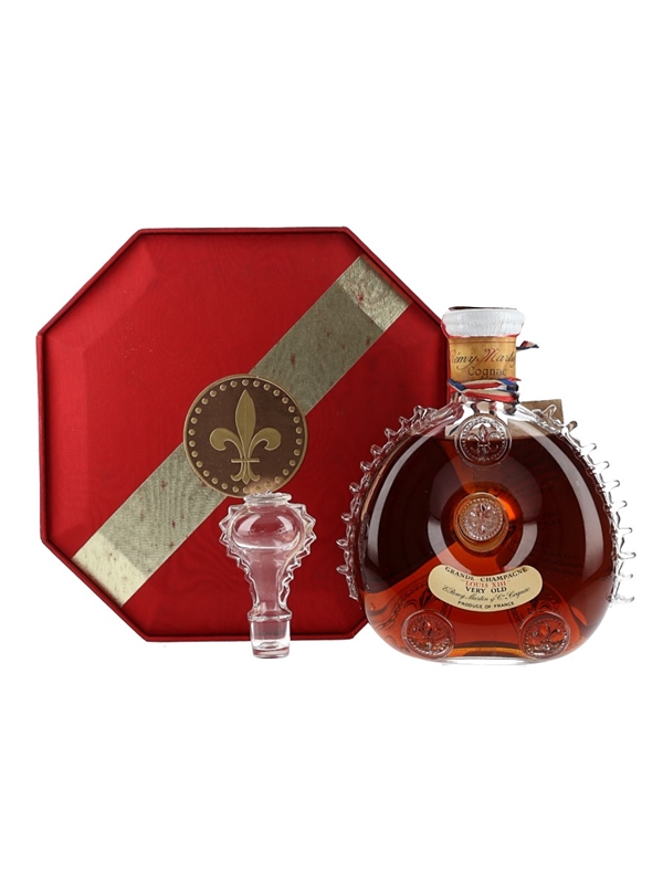 A bottle of Remy Martin Louis XIII Cognac, presented in a Baccarat crystal decanter with stopper. This is composed of Grande Champagne eaux-de-vie aged between 40 and 100 years and is presented in a crystal decanter. We estimate this was bottled in the 1970s.
