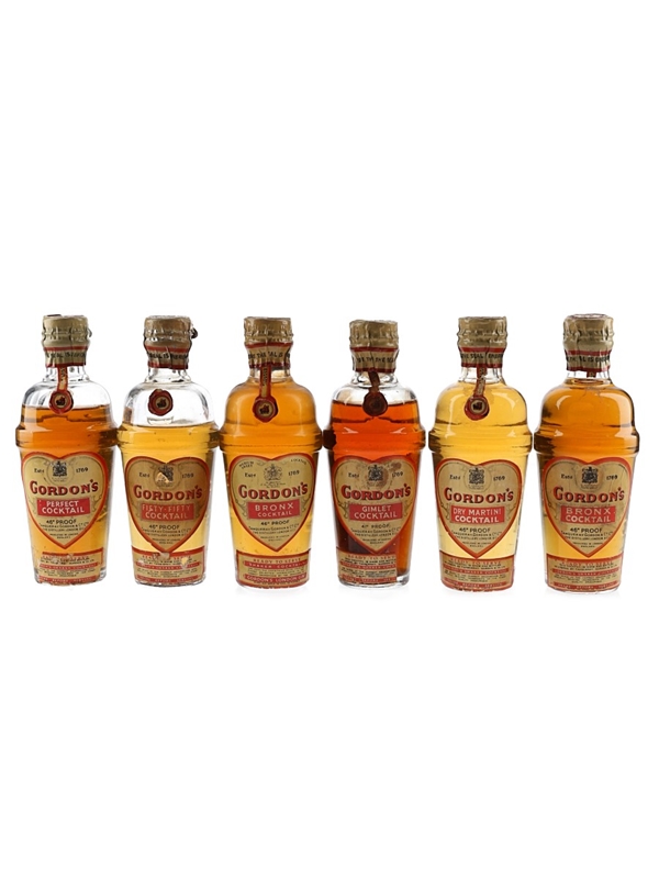 This lot contains six miniature bottles of Gordon's Cocktails including Bronx Cocktail, Perfect Cocktail, Dry Martini Cocktail, Fifty-Fifty Cocktail and Gimlet Cocktail