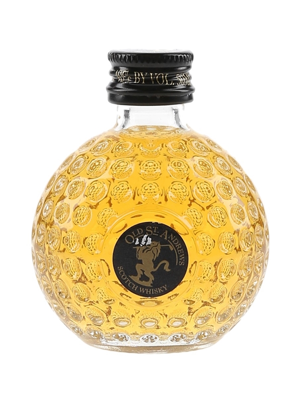 A miniature bottle of Old St Andrews Scotch Whisky, presented in a golf ball shaped bottle.