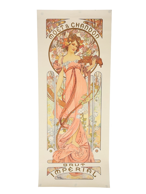 A Moet & Chandon Brut Imperial poster produced as promotional material for the brand in the mid 1990s. This is a reproduction of one of Alphonse Mucha's advertisements from the end of the 19th century, and measures 65cm x 26cm.