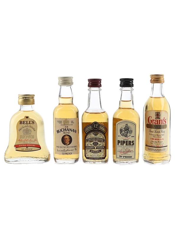 This lot contains five miniature bottles of blended Scotch whisky including Bell's Extra Special, Buchanan's The Blend, Chivas Regal 12 Year Old, Grant's Standfast and Hundred Pipers. We estimate these were bottled in the 1970s.