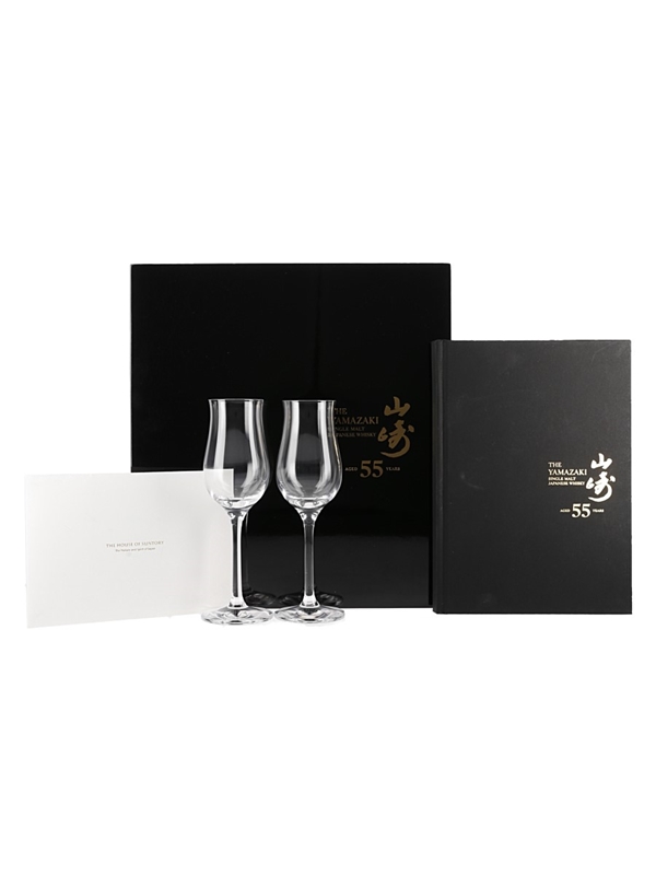 A pair of Yamazaki 55 Year Old whisky tasting glasses, presented in wooden box with booklet. The tasting glasses are by Stölzle, and measure approximately 17cm tall.