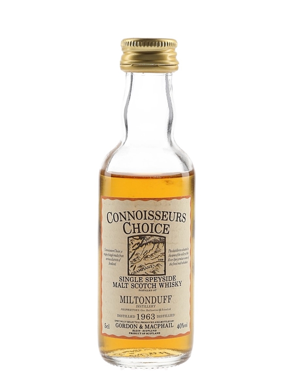 A miniature bottle of Miltonduff 1963 Single Speyside Malt Scotch Whisky bottled by Gordon & MacPhail as part of the Connoisseurs Choice series. We estimate this was bottled in the 1990s.