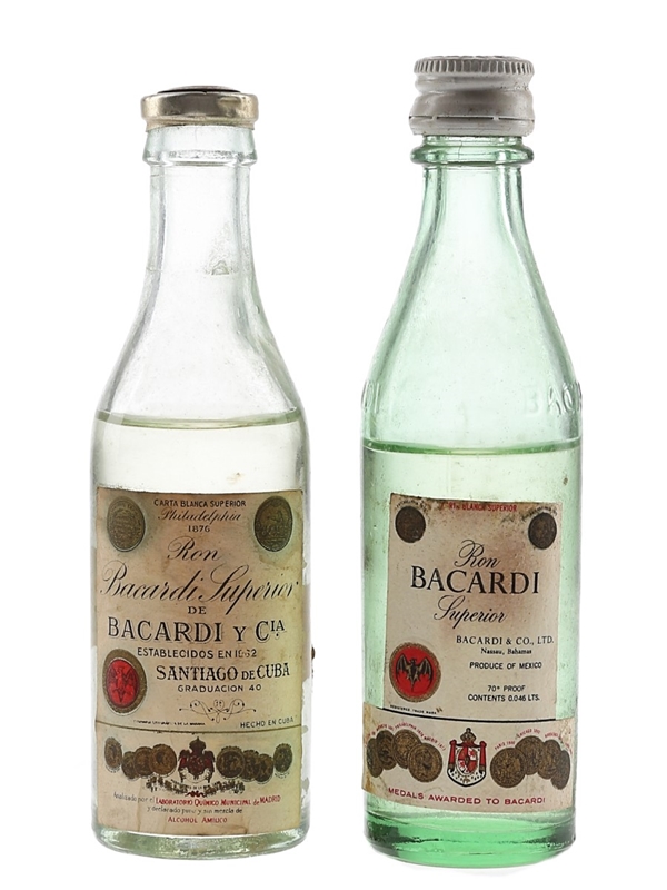 This lot contains two miniature bottles of Bacardi rum including Bacardi Ron Superior from Bahamas and Bacardi Ron Superior from Cuba.