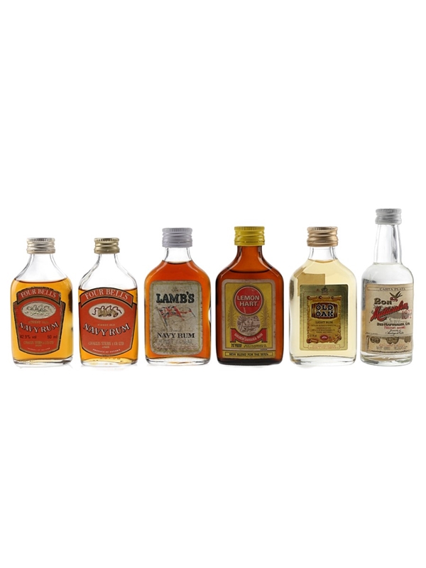 This lot contains six miniature bottles of Four Bells Navy Rum, Lamb's, Lemon Hart, Old Oak and Ron Matusalem. We estimate these were bottled in the 1970s to 1980s.