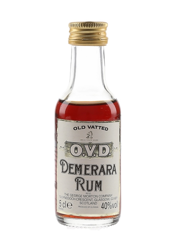 A miniature bottle of OVD Old Vatted Demerara Rum produced by George Morton. We estimate this was bottled in the 1980s.
