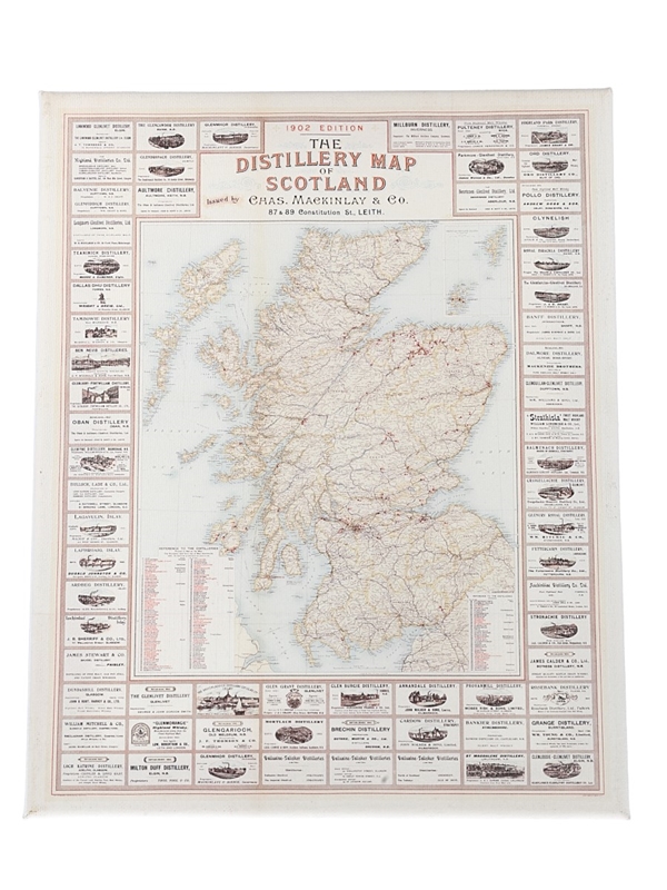 This lot contains a canvas map of Scotland's malt whisky distilleries.