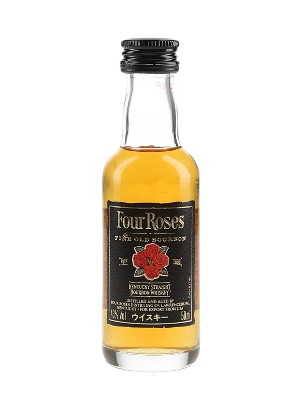 A miniature bottle of Four Roses Kentucky Straight Bourbon Whiskey bottled for the Japanese Market.