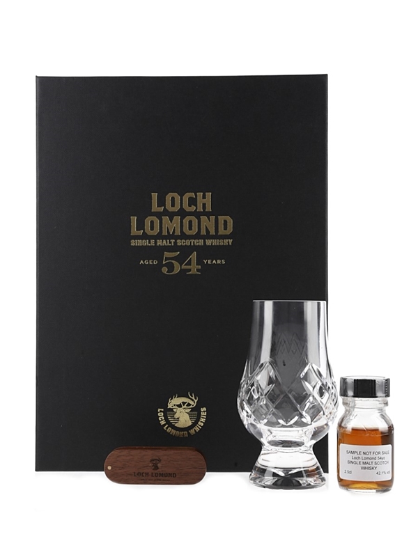 A presentation box from Loch Lomond distillery which includes a 2.5cl miniature sample bottle of Loch Lomond 54 Year Old Single Malt Scotch Whisky. This comes with a tumbler and a USB stick.