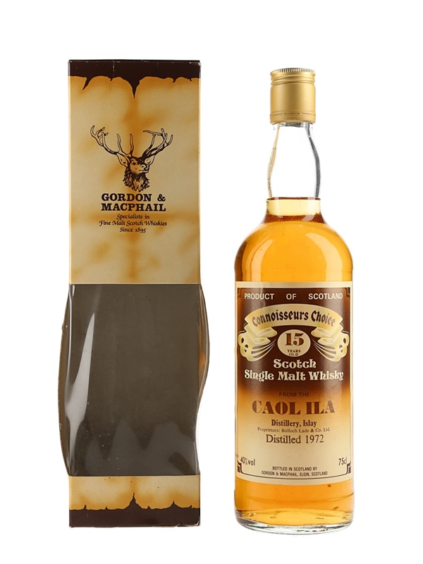 A bottle of Caol Ila 1972 15 Year Old Single Malt Scotch Whisky, distilled in 1972 and bottled by Gordon & MacPhail as part of the Connoisseurs Choice series. We estimate this was bottled in the 1980s.