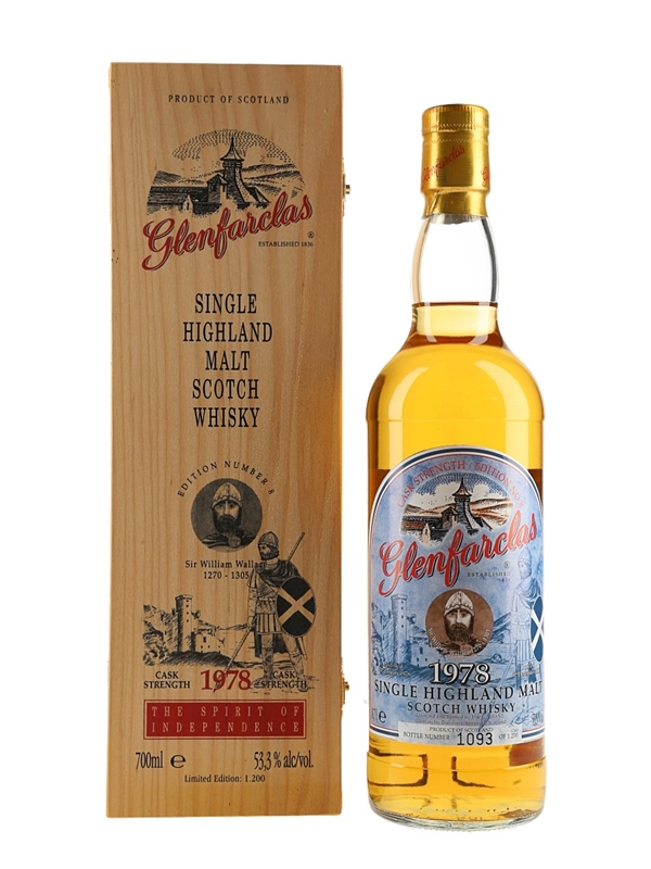 A bottle of Glenfarclas 1978 The Spirit Of Independence Cask Strength Edition No.8 Single Highland Malt Scotch Whisky, produced by J. & G. Grant. This whisky was bottled on 9 December 2002 for the German market and features Sir William Wallace. This is bottle number 1093 of 1200.