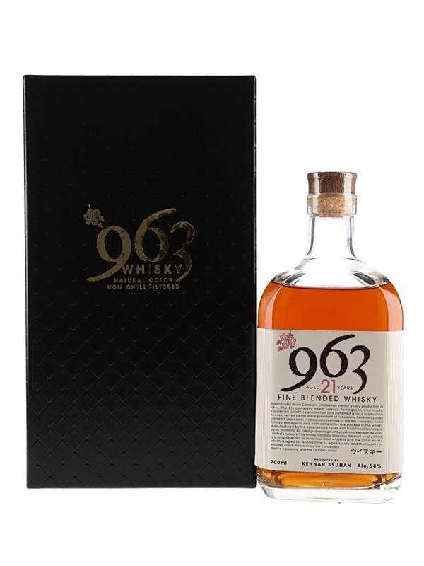 A bottle of Yamazakura 963 21 Year Old Fine Blended whisky from Sasanokawa Shuzo distillery, Japan. This is a blend of aged grain and malt whiskies.