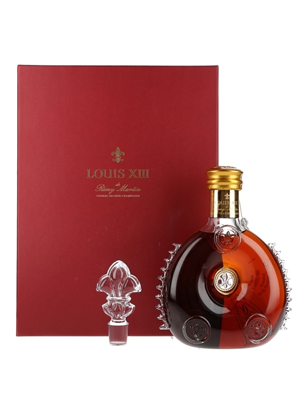 A bottle of Rémy Martin Louis XIII Cognac. This is composed of Grande Champagne eaux-de-vie aged between 40 and 100 years and is presented in a Baccarat crystal decanter. The bottling code indicates this was bottled in 2019. This comes with two packets of invites for tasters to join the Louis XIII Society and a welcome booklet detailing the history of the brand.