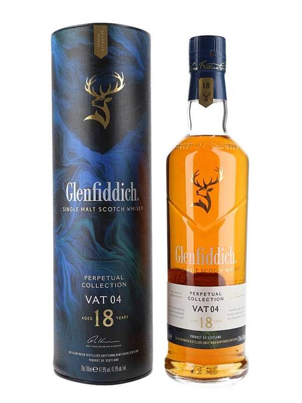 A bottle of Glenfiddich Perpetual Collection Vat 04 18 Year Old Single Malt Scotch Whisky. This was matured in Oloroso sherry and bourbon casks for over 18 years before ripening in their Solera Vat 04. This was bottled exclusively for global travel retail.
