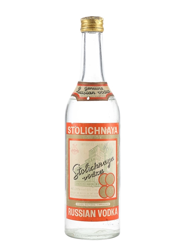 A 50cl bottle of Stolichnaya Russian vodka. This was produced in the USSR, we estimate in the 1980s. Today, Stolichnaya is produced in Latvia.