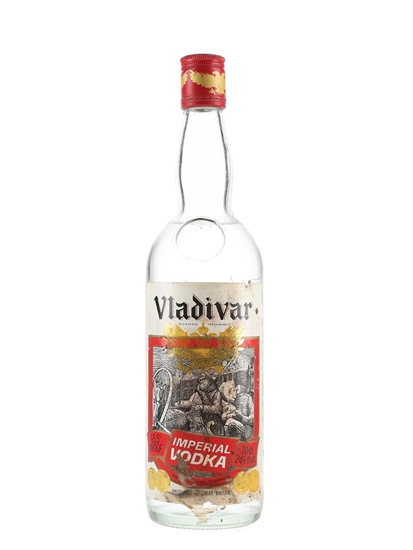 A bottle of Vladivar Imperial Vodka, produced by Gilbert & John Greenall Ltd. in Warrington, Great Britain. We estimate this was bottled in the 1970s.