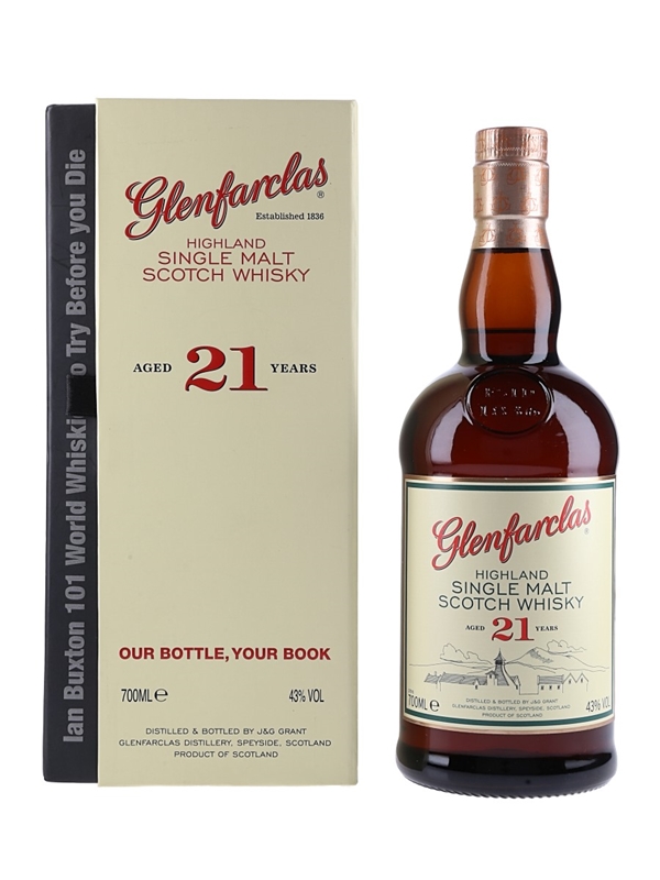 A bottle of Glenfarclas 21 Year Old packaged with a copy of 101 World Whiskies To Try Before You Die by Ian Buxton.