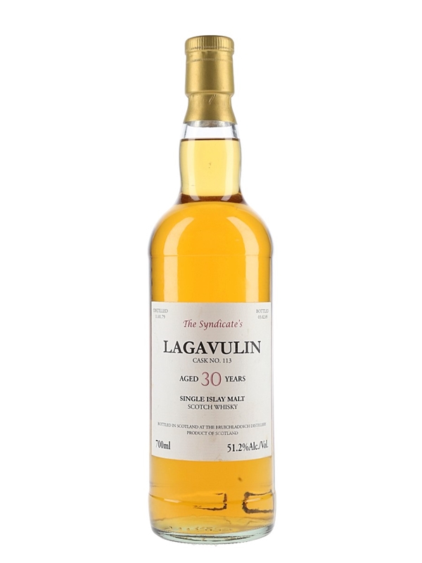 A bottle of The Syndicate's Lagavulin 30 Year Old Single Islay Malt Scotch Whisky. This was distilled on 11 January 1979, matured in a single cask and bottled at 51.2% ABV on 3 February 2009 at Bruichladdich Distillery.