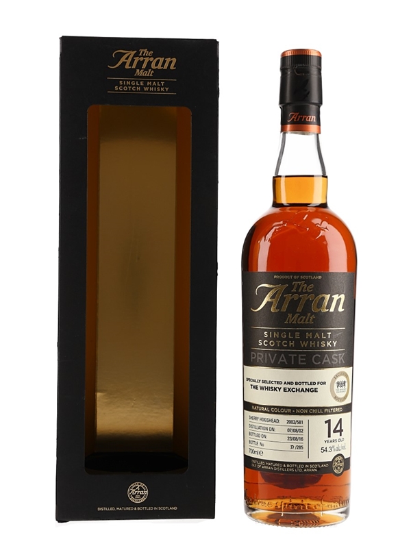 A limited edition bottle of The Arran Malt 14 Year Old. This was distilled on 7 August 2002 , matured in a single sherry hogshead, and bottled on 23 August 2016 as a part of Arran's Private Cask series. This was specially selected and bottled for The Whisky Exchange.