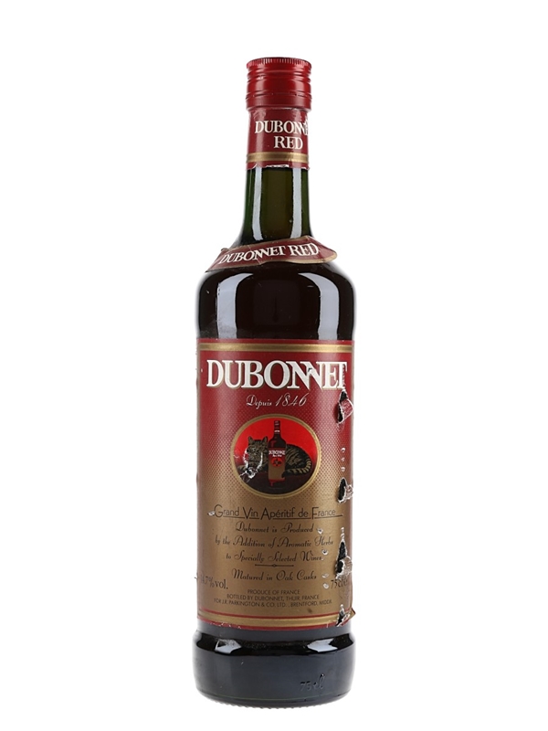 A bottle of Dubonnet Wine Aperitif, a fortified wine flavoured with herbs, spices, and quinine.