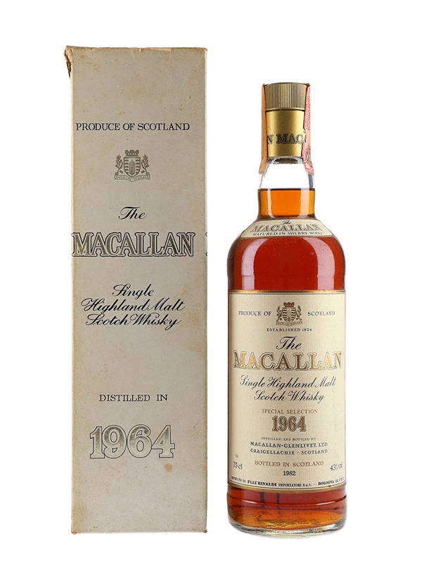 A bottle of The Macallan 1964 Single Highland Malt Scotch Whisky, matured in sherry casks and bottled in 1982 for Italian importer Rinaldi.
