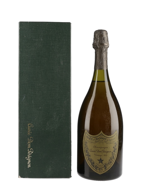 A bottle of 1973 Dom Pérignon vintage Champagne from Möet & Chandon, a blend of 50% Pinot Noir and 50% and 50% Chardonnay.