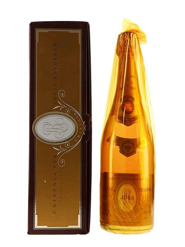 A bottle of 1983 Louis Roederer Cristal Vintage Champagne, a 60% Pinot Noir and 40% Chardonnay blend.