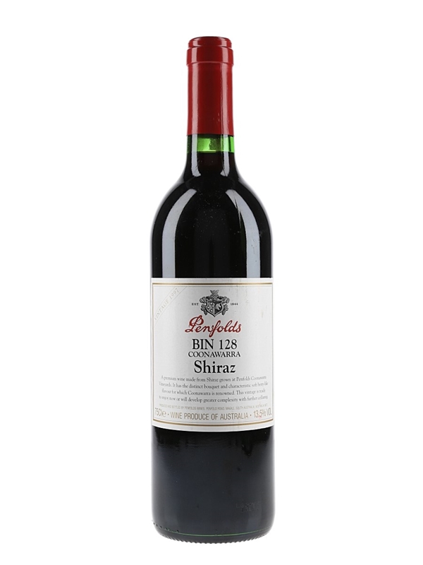 A bottle of 1997 Penfolds Bin 128 Shiraz from South Australia's cool climate Coonawarra district, grown on red Terra Rosa soils.