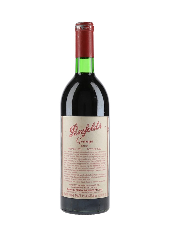 A bottle of 1981 Penfolds Grange, Bin 95, bottled in 1983.