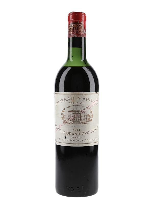 A bottle of 1961 Chateau Margaux Premier Grand Cru Classé from Bordeaux. Margaux is planted with 66 hectares of red grape varieties; 75% Cabernet Sauvignon, 20% Merlot and 5% each Petit Verdot and Cabernet Franc.